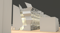A-THEATER Project was created as part of the assignment for ARH255. The site is located on the corner of 5th st. and Howard st. in San Francisco. This building features 1 large theater on the second floor and 1 multipurpose theater on the third floor. The multi-purpose theater can be converted into 2 smaller theaters by closing the partitions or it can perform as a large theater with a center stage. The first floor of the building features a lobby, cafe, and an amphitheater. The design of this project was derived from the UNTITLED COMPOSITION by Lygia Clark. Design elements consist of triangulation, transparency, array, and folding. The outer facade is the continuation of the structural elements of the theaters and other spaces within the design.