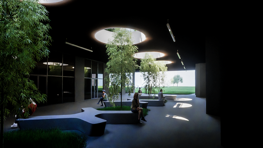 Our building project aims to blend the city with nature. The main idea was to make sure that people living there could see both the beautiful park and the city. The building was carefully placed to catch lots of sunlight during winter months, so it felt bright and warm inside. During the summer months, the positioning of the units and floors allows them to block the direct sunlight and reduce heat gain. The idea of the building position is to achieve energy saving and reduce impact on the environment. All of the circulation corridors and connections between the 4 towers are open on the sides to allow fresh air and wind to cool down the mass and improve air quality as well as reduce the energy required to cool down the spaces. The 4 towers provide views, natural light, and fresh air to each of the units in the project. The second level features the first residential units and a garden with grass and small trees to bring nature into the lives of the residents. ! The first floor features a covered alley with open skylights and trees. This allows for the fresh air and natural light to penetrate even the rough concrete podium floor. With the garden being on the second floor and on the side of the site neighboring Snow Park it feels as if the park is flowing into the residential units.